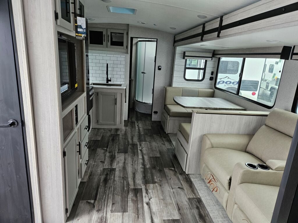 Introducing the 2024 Crossroads Sunset Trail Super Lite SS253RB, a remarkable travel trailer designed for those who appreciate adventure while enjoying the comforts of home. With a length of 29.86 feet, this RV is compact yet spacious enough to comfortably accommodate six individuals, making it ideal for family trips or gatherings with friends. The new condition of this model assures you that it is ready to hit the road without worry. It features one slide-out that extends the living area, allowing for a generous and flexible space perfect for relaxing or entertaining. Equipped with front and rear power leveling jacks, setting up your home away from home has never been easier. The RV weighs a dry weight of 5,738 pounds and has a gross vehicle weight rating (GVWR) of 7,550 pounds, coupled with a hitch weight of 666 pounds, ensuring that it is easy to tow. The one awning adds outdoor living space, making it a perfect addition for enjoying sunny days or shady retreats. This model does not have a bunkhouse, thus providing a more open atmosphere for its guests to socialize and enjoy. Stock#: E5724, VIN: 4YDTSSM20RS350550.